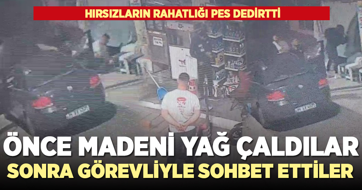Denizli’de rahat ve umursamaz tavırları ile çalışanın yanı başında hırsızlık yapan grup güvenlik kamerasına yansıdı. Stanttan aldıkları madeni yağı araçlarına boşaltıp, etrafta arama yaptılar.
